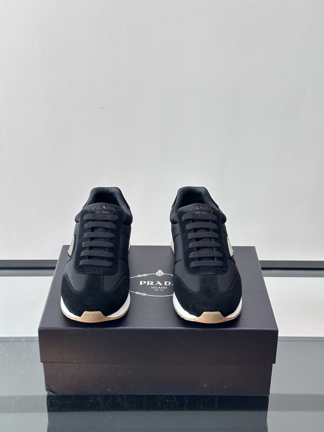 These sneakers are crafted from suede and cowhide, featuring soft and delicate leather with natural texture for enhanced breathability. A rubber triangular logo adorns the outer side of the shoe, while the tongue and heel are detailed with the brand’s letter logo. They come with an ultra-lightweight textured rubber thick outsole, with PRADA letter logos on the sides, and cowhide lining for a comfortable fit. Exquisitely designed and versatile! Sizes: 39-44 (Size 38 and 45 available for customization)
