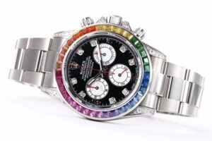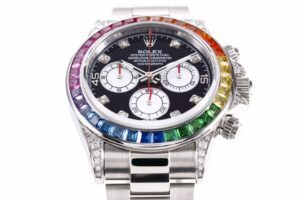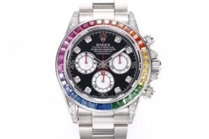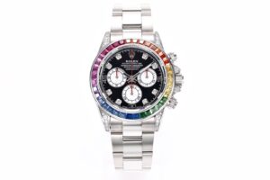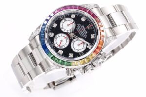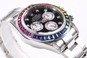 The all-new Daytona Rainbow Edition. Model: 116599RBOW-116598RBOW-116595RBOW. It’s hard to find a Rainbow Diton watch! The inlay is optimized with 36 gemstones that have the most harmonious transition according to the original factory color gradient. The height and angle are consistent, and the refraction effect is very beautiful. Each timing dial refracts light differently, resulting in bright and unique colors. Equipped with the original consistent Cal.4130 mechanical timing movement, sapphire crystal clear effect mirror, Rolex special ear, steel solid chain oyster style adjustable strap, polished and finely polished. Authentic purchasing packaging with corresponding styles and models, recommended for the highest quality.